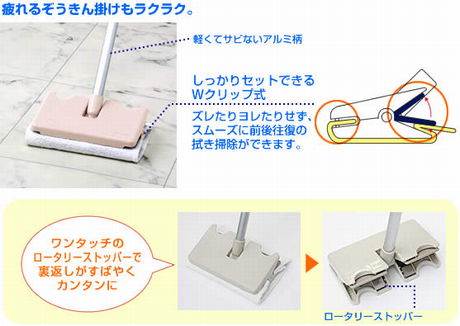 ●Wクリップ式で雑巾を固定し、床をしっかり拭くことができる